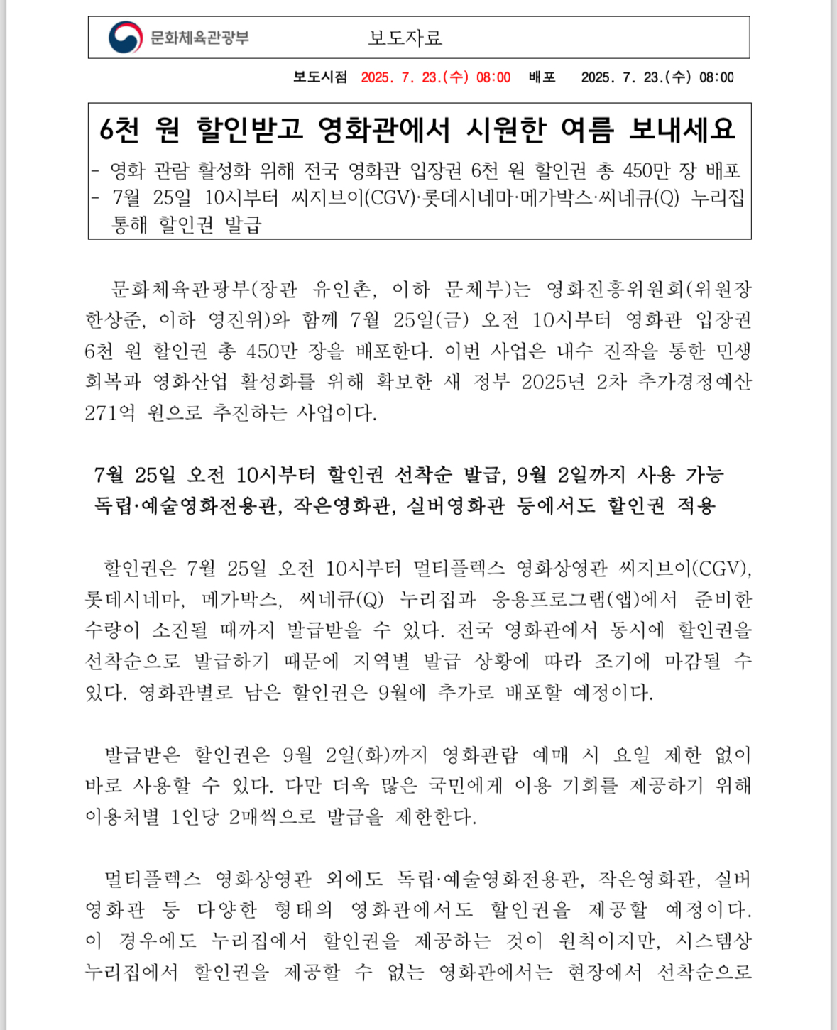 - 대상 극장: CGV, 롯데시네마, 메가박스, 씨네큐 등