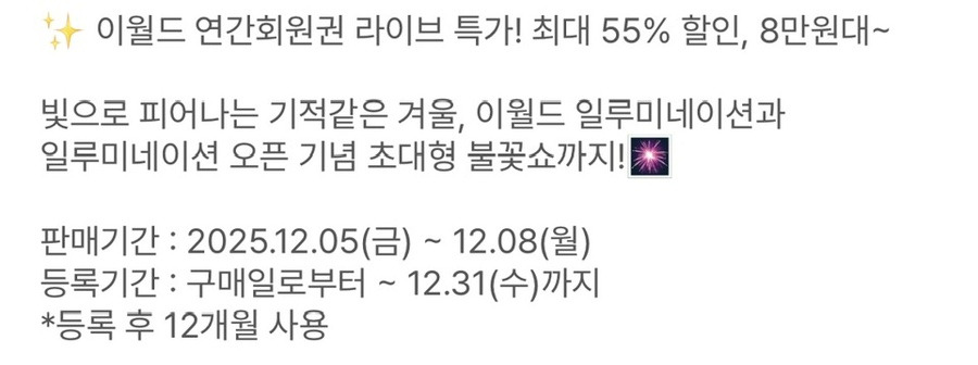 | 오크밸리 쿠키런 스위트랜드 눈놀이동산 입장권 단독특가 최대 43% 할인 시작! (0) | 2025.12.05 |