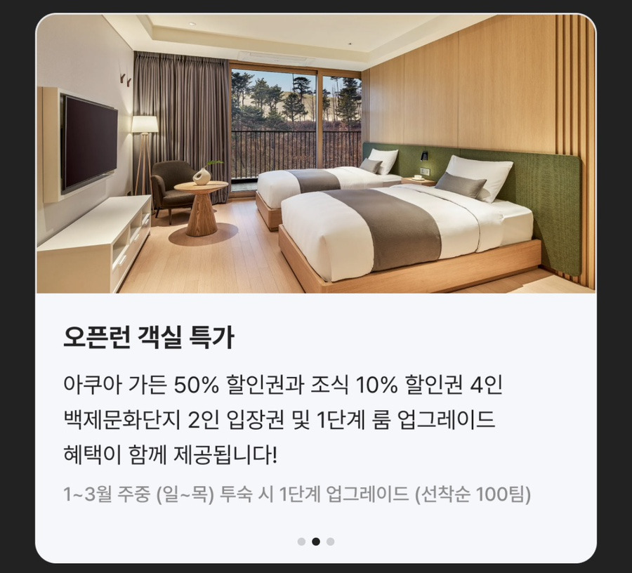 아쿠아 가든 할인권, 조식 할인, 룸 업그레이드까지