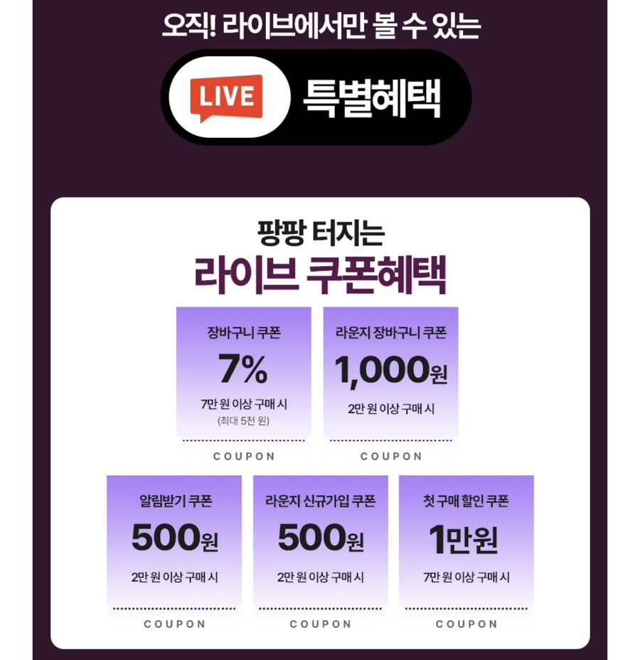 라이브 쿠폰은 장바구니 7% 할인