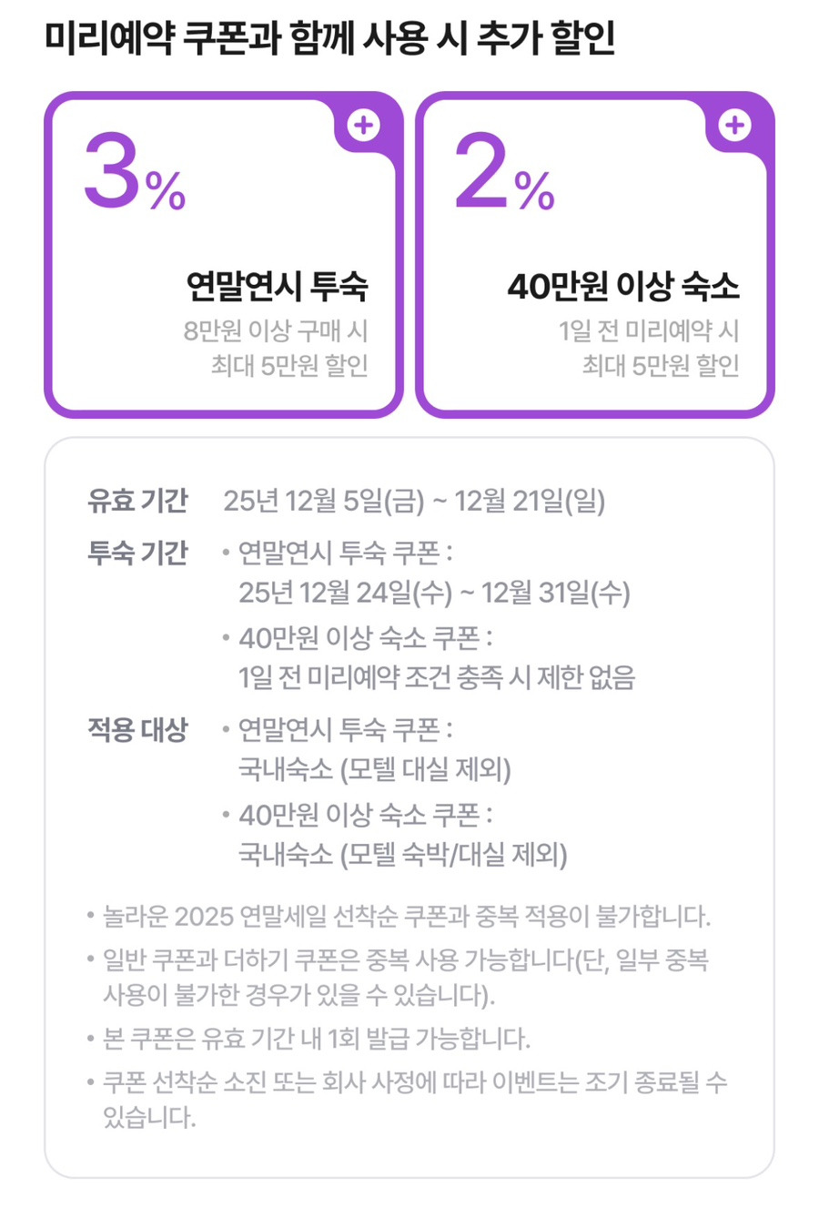 올해 마지막 국내숙소 선착순 25% 쿠폰 받기