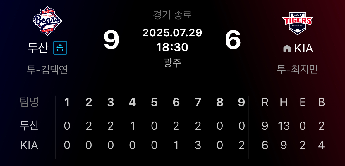 7월 29일 두산 vs KIA 경기 결과는 9:6 두산 승!
