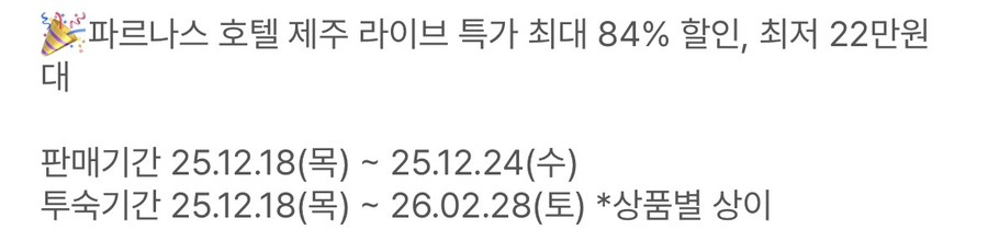 [파르나스 호텔 제주] 설레는 겨울 럭셔리 호텔 특가 12월 18일 오후 7시