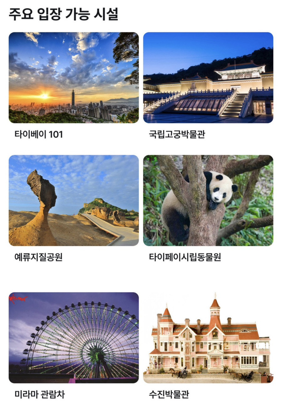 교통과 어트랙션이 결합된 유일한 패스! 타이페이 펀 패스를 이용해보세요. [이 상품의 매력 포인트!] • 타이페이 101 전망대, 국립 고궁 박물관 등 무려 30개 이상의 명소들을 둘러볼 수 있어요.