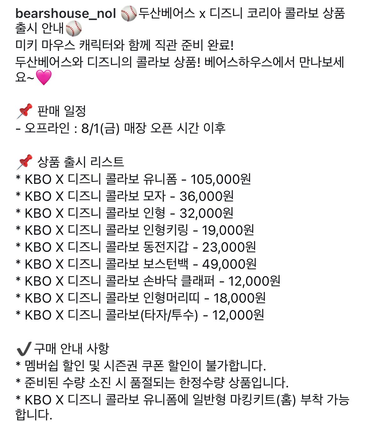 | 두산베어스 최강래시 시즌2 콜라보 한정판 굿즈 오프라인 판매 | 디즈니 콜라보 비교 구경 찬스 (1) | 2025.07.31 |