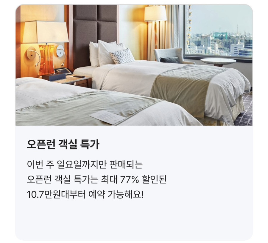 | 신라스테이 삼성 오픈런 특가 | 최대 70% 할인 10만 원대부터 예약 가능 (2) | 2026.01.01 |